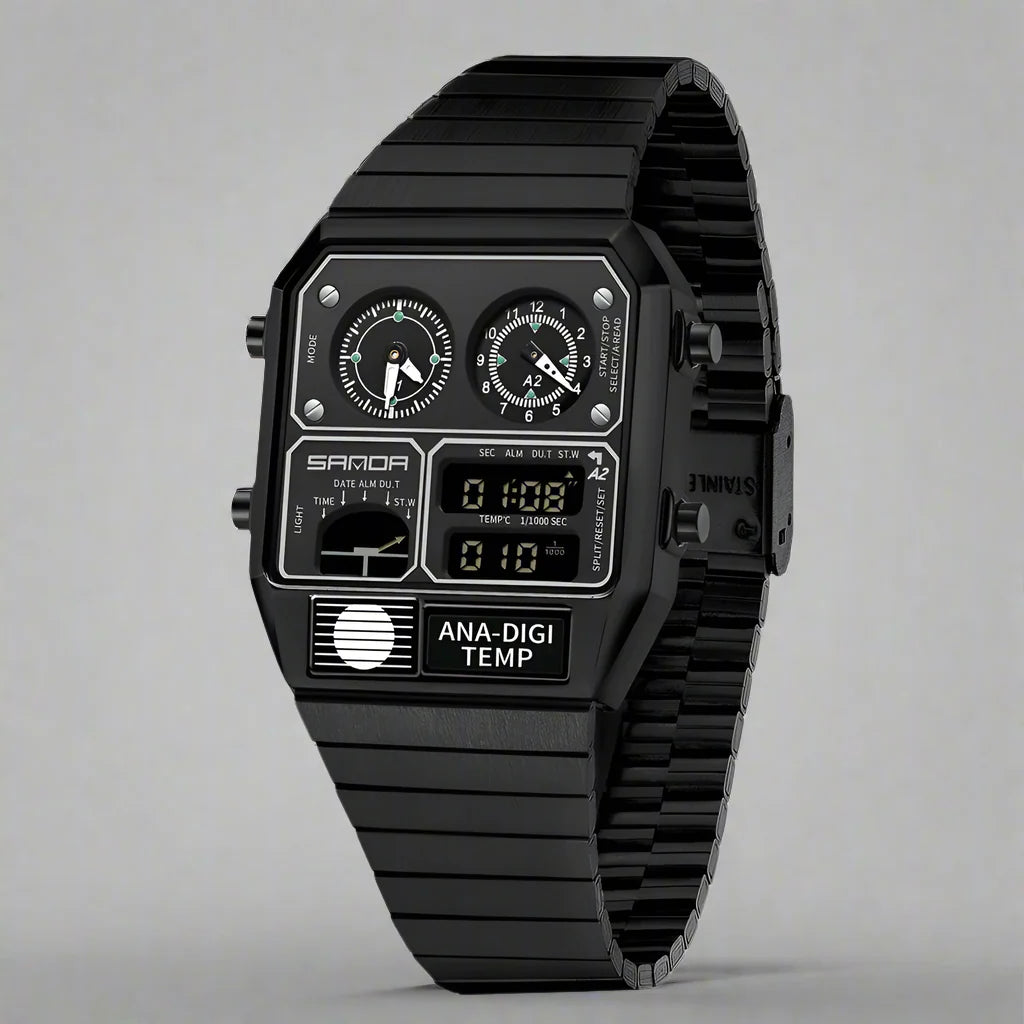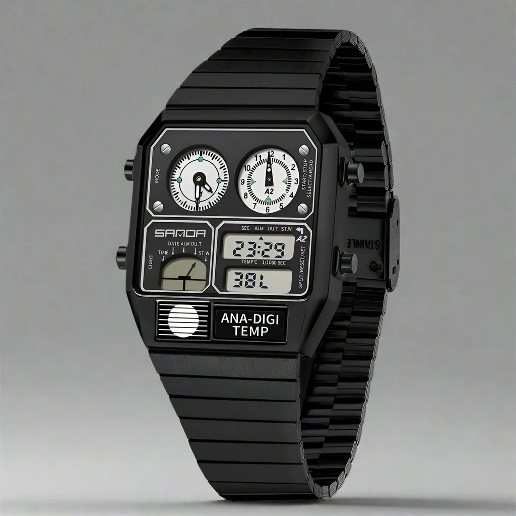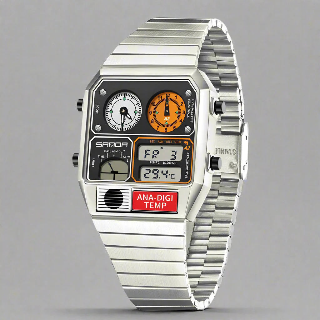 A watch that does more than tell time. With its sleek, stainless steel design and essential tools like temperature tracking and luminous features, it’s a statement of functionality and innovation.