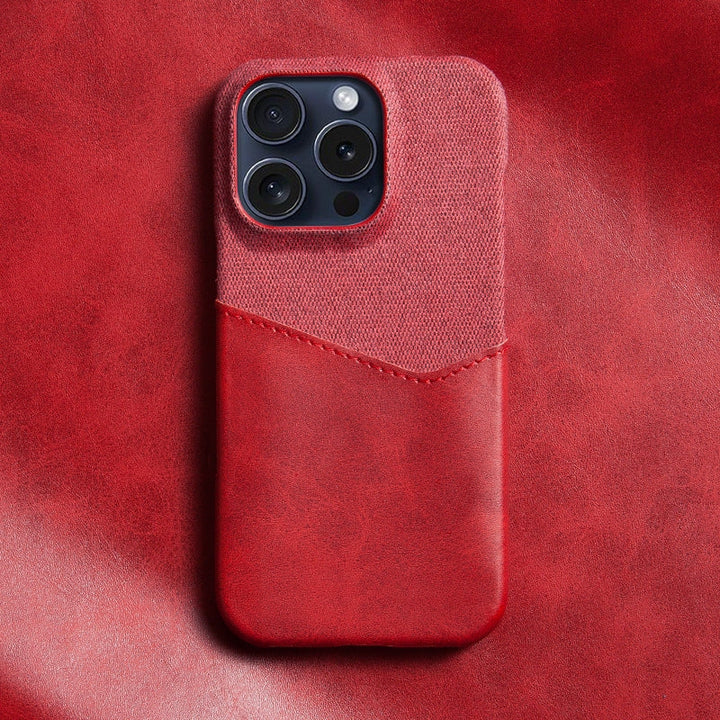 A polished pairing of genuine leather and textured canvas—crafted for grip, built for wear, and finished with MagSafe compatibility and a hidden card slot.