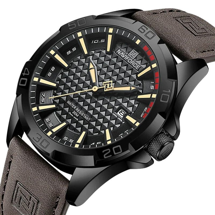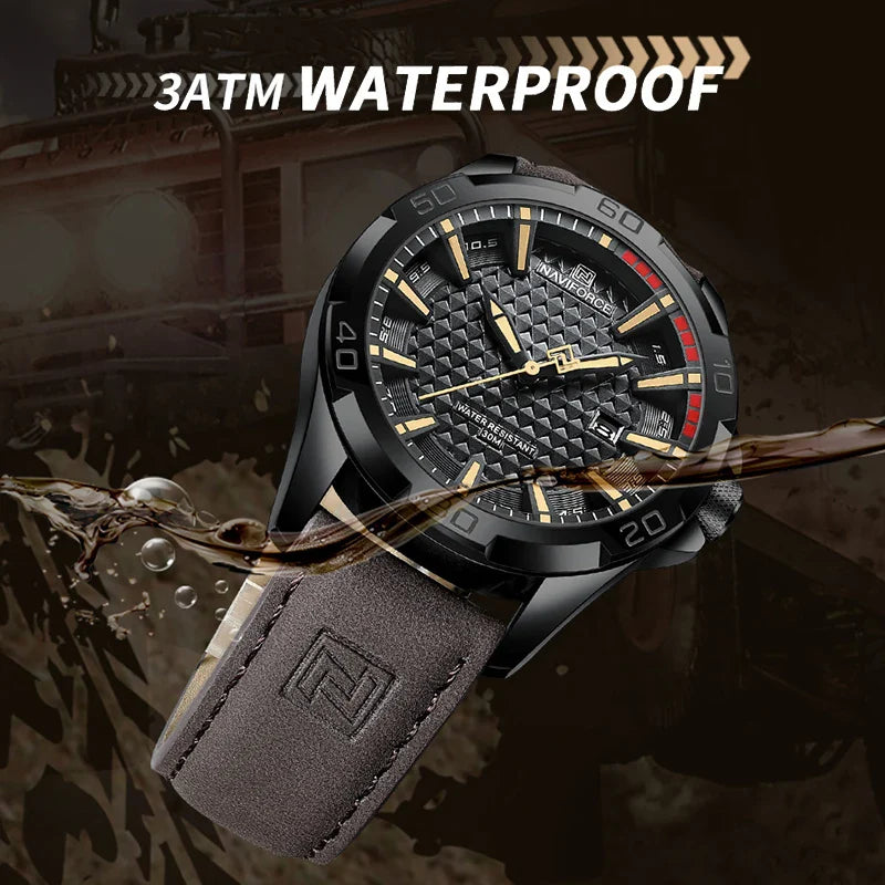 This timepiece features a reliable Quartz Calendar movement and a high-quality battery, ensuring accurate timekeeping and long-lasting performance. Its 3ATM waterproof rating, leather strap, and hardened mineral glass combine durability with comfort.