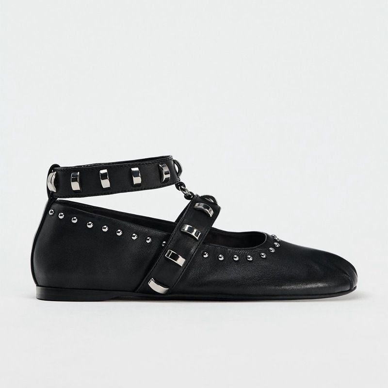 Ballet? Barely. This pair flips softness into strength with sharp metal hardware, raw texture, and a stance that doesn’t fold.