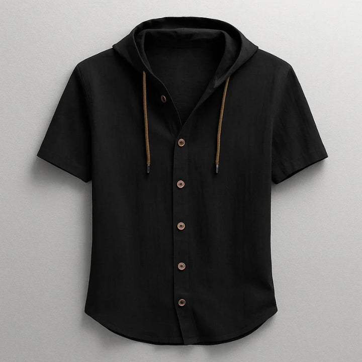 Woven from a lightweight cotton-linen blend, this short-sleeve shirt pairs crisp structure with a breathable, soft-washed feel. The hooded design adds a laid-back detail without compromising on refinement.