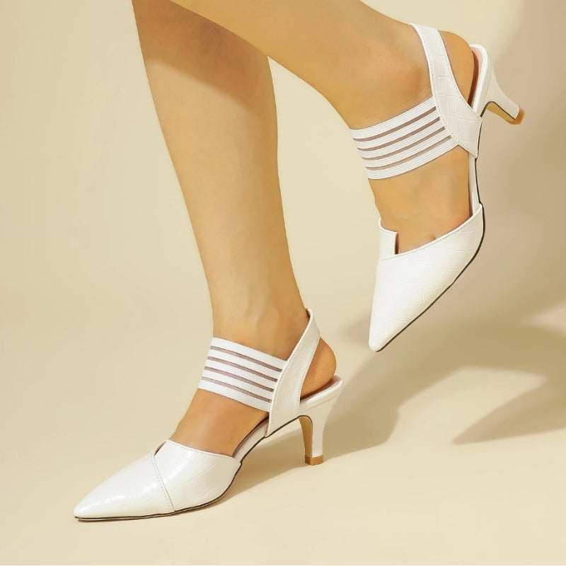 Designed for hold without pressure, the striped elastic bands hug the foot with a balanced fit, while the cushioned insole and mid-height heel ease your stride from step one.